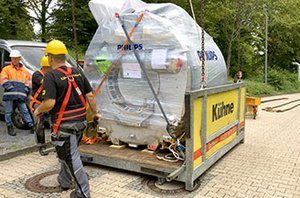 Im Sommer 2019 ergänzte das Universitätsklinikum Aachen, das eines der größten Krankenhausgebäude Europas besitzt, die Ausstattung der Radiologie um zwei solcher Hightech-Geräte. Beide waren bei einem der führenden Anbieter bestellt worden, der Philips Healthcare in Hamburg, und dieser hatte in dem Zuge auch für die Anlieferung und Einbringung Sorge zu tragen.