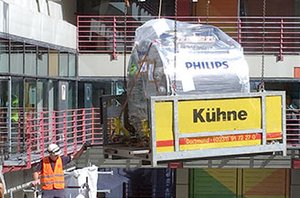 Als Spezialist für MRT-Transporte genießt DMS Kühne das langjährige Vertrauen von Philips Healthcare. Im Sommer 2019 wurde die Spedition mit der Einbringung von zwei MRT-Geräten in die Uniklinik Aachen betraut. Das Projekt erforderte umfangreiche Vorarbeiten sowie den Einsatz eines Großkrans. DMS Kühne verbrachte die Systeme erfolgreich in die Radiologie in der fünften Etage des Klinikums.